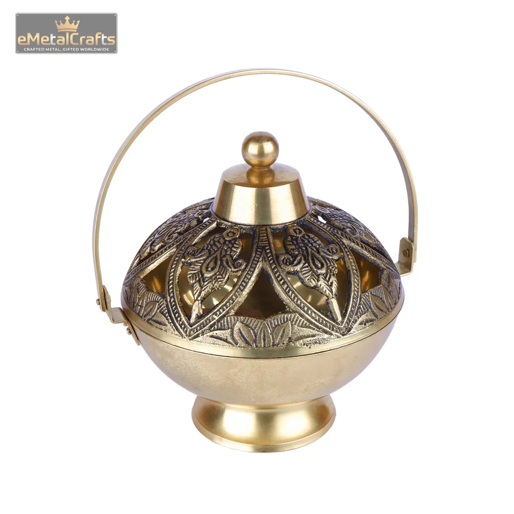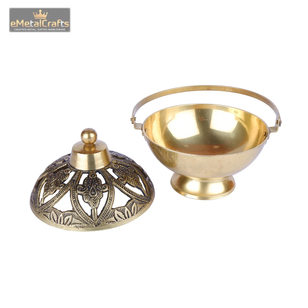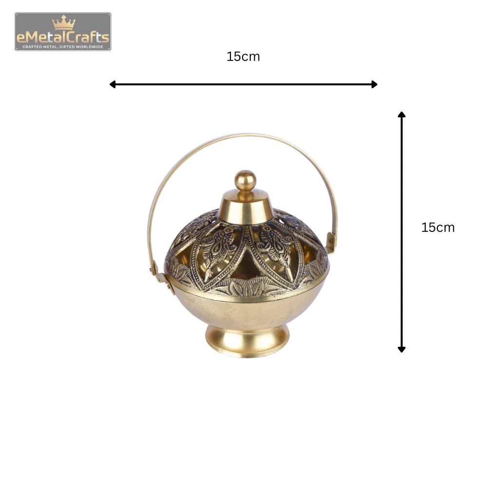 This elegant pure brass dhoop dani pooja incense is designed to elevate your spiritual rituals by spreading the purifying aroma of loban or incense. The dome is adorned with intricate floral carvings and cutwork patterns, allowing fragrant smoke to gently diffuse, creating a serene and positive ambiance. A sturdy, rounded handle ensures easy portability, while the wide, stable base offers secure placement during use. Blending functionality with aesthetic charm, this piece is perfect for temples, pooja rooms, or home décor.