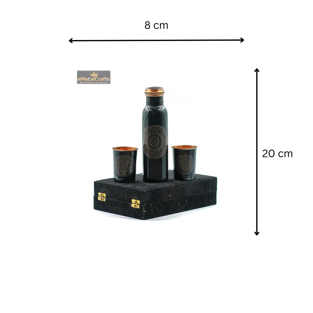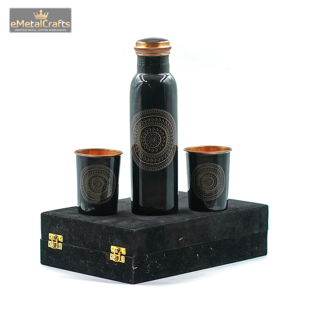 This meticulously crafted set, featuring a pure copper water bottle and two matching glasses, is made of copper, celebrated for its lustrous quality and traditional significance. The pieces exhibit a dramatic two-tone finish: a deep, darkened body etched with fine detail is accented by warm, coppery rims and bases. This striking metallic contrast lends a refined, inspired look. The entire collection is designed to promote wellness, as copper is historically favored for storing and drinking water. It comes beautifully packaged in a secure, plush-covered black presentation box, ensuring it is ready for gifting or safe keeping.