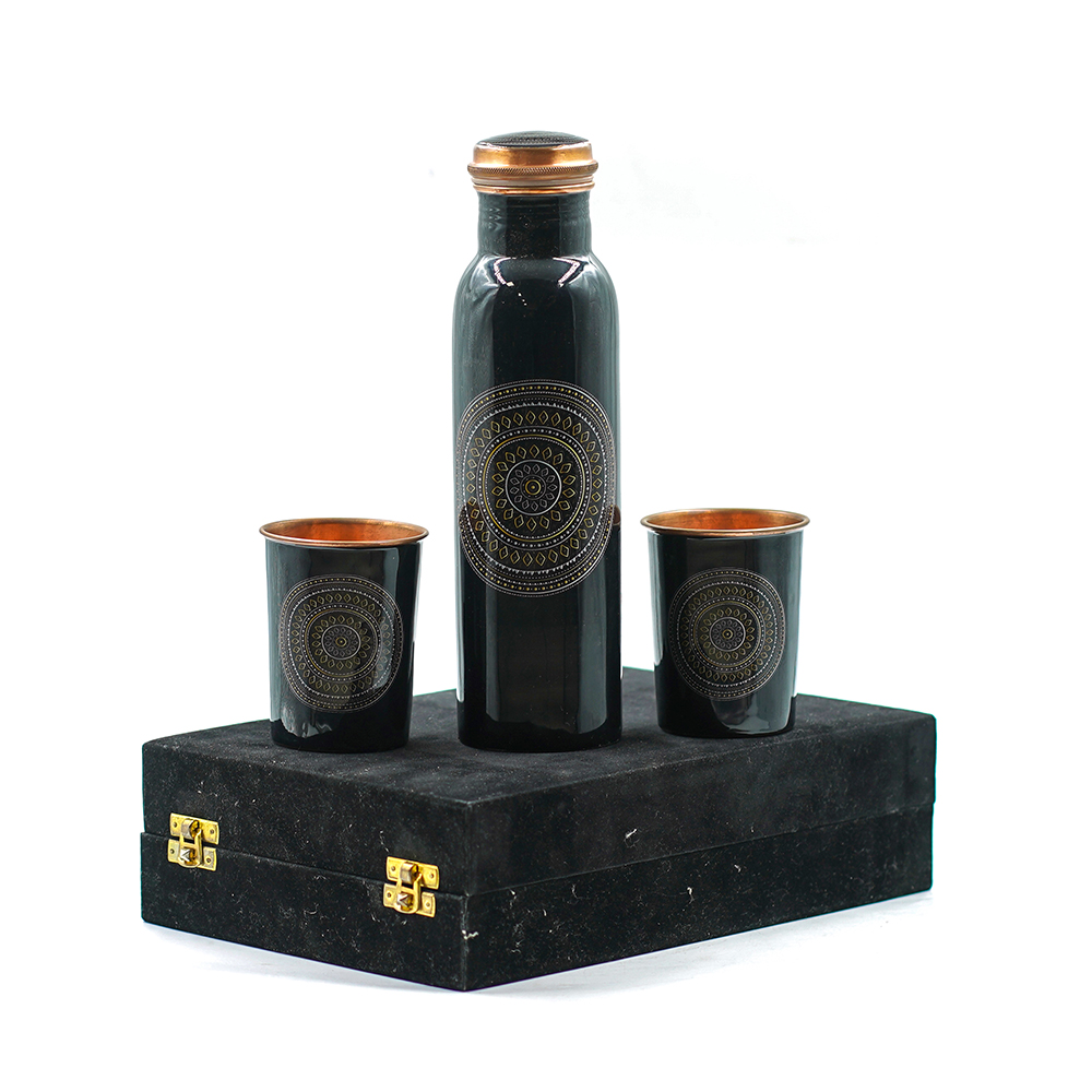 This meticulously crafted set, featuring a pure copper water bottle and two matching glasses, is made of copper, celebrated for its lustrous quality and traditional significance. The pieces exhibit a dramatic two-tone finish: a deep, darkened body etched with fine detail is accented by warm, coppery rims and bases. This striking metallic contrast lends a refined, inspired look. The entire collection is designed to promote wellness, as copper is historically favored for storing and drinking water. It comes beautifully packaged in a secure, plush-covered black presentation box, ensuring it is ready for gifting or safe keeping.