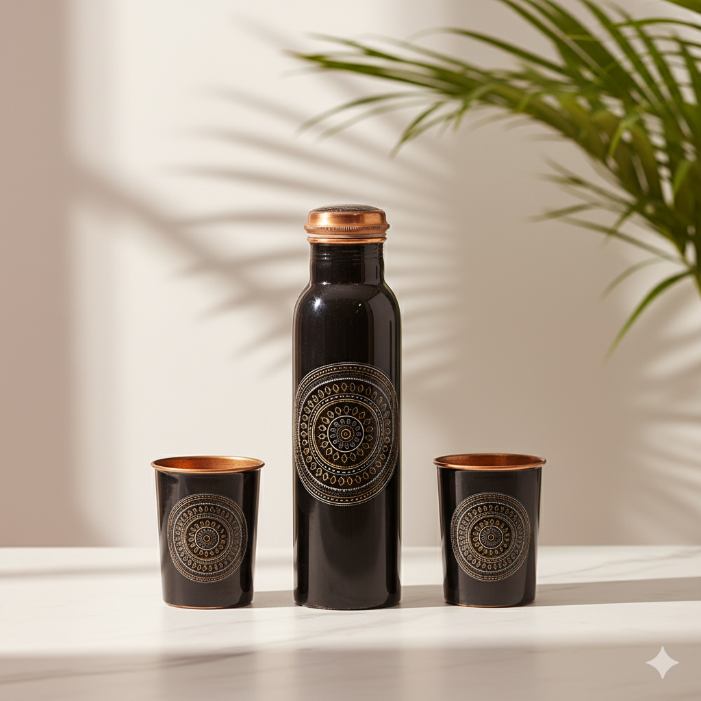 Elegant solid pure copper water bottle and two-glass set with dark patina and copper accents, promoting wellness, crafted in India, beautifully packaged for gifting.
