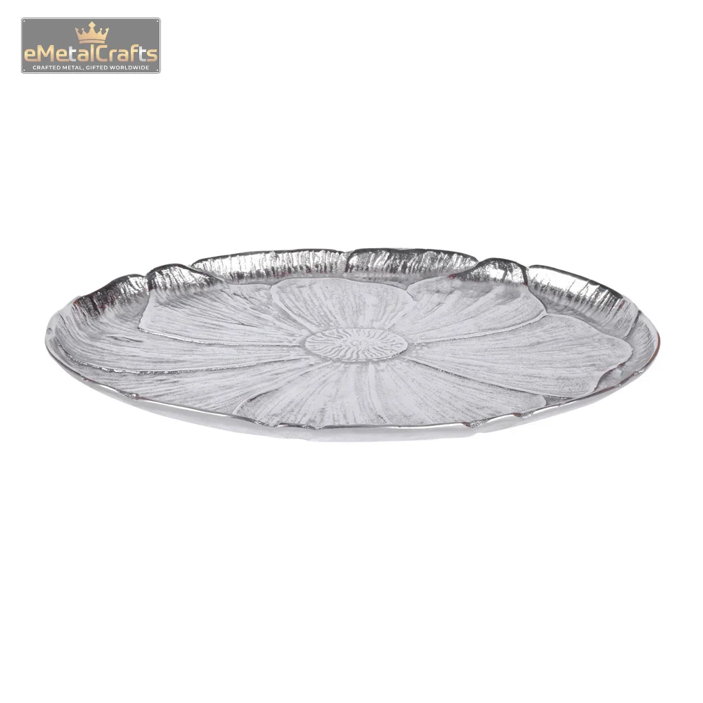 Adorn your table or display with this elegant Silver-Plated Embossed Floral Platter. Crafted round shape silver leaf platter with a gleaming silver-plated finish, this oval-shaped platter features a prominent and beautifully detailed embossed floral design at its center, with petals radiating outwards. The rim of the platter has a textured, slightly uneven edge, mimicking organic forms and adding to its artistic appeal. Perfect for serving canapés, sweets, or simply as a stunning decorative tray for candles or other accents, this round shape silver leaf platter brings a touch of refined elegance to any occasion or setting.