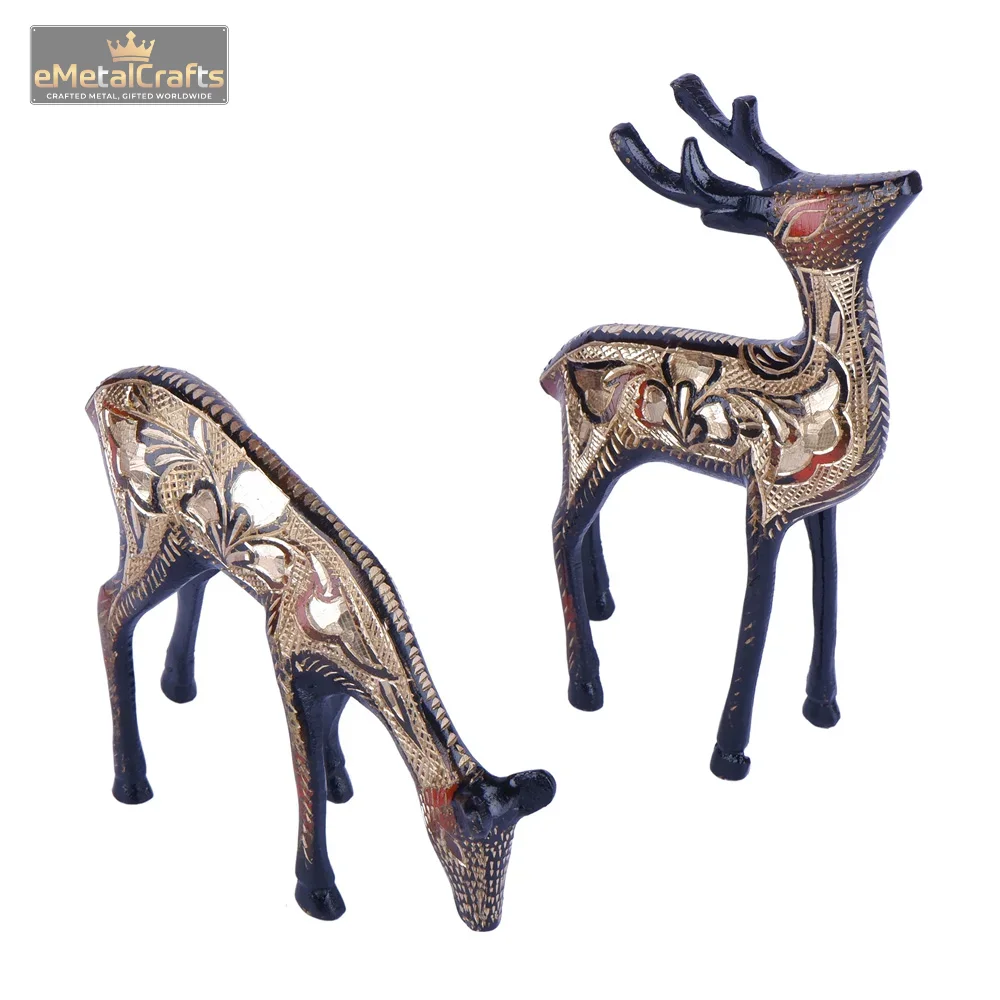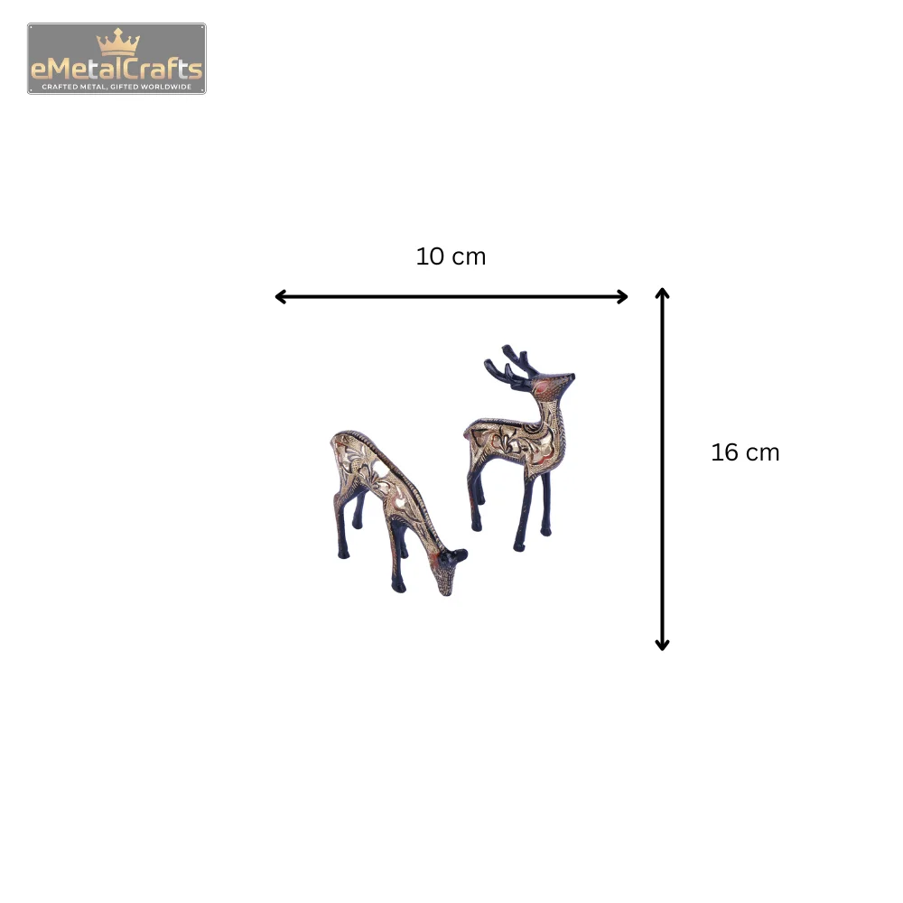 Adorn your space with this exquisite set of two ornate brass set of two ornate golden embossed deer figurines. Crafted from metal with a rich dark finish, these charming deer feature stunning golden embossed patterns resembling intricate foliage and scrollwork. One deer is depicted with graceful antlers, while the other bows its head in a serene pose. Perfect for adding a touch of elegance and artisanal beauty to any shelf or tabletop, they make a delightful decorative accent or a unique gift.