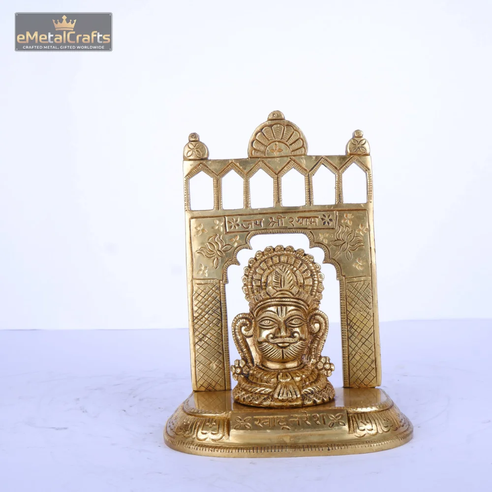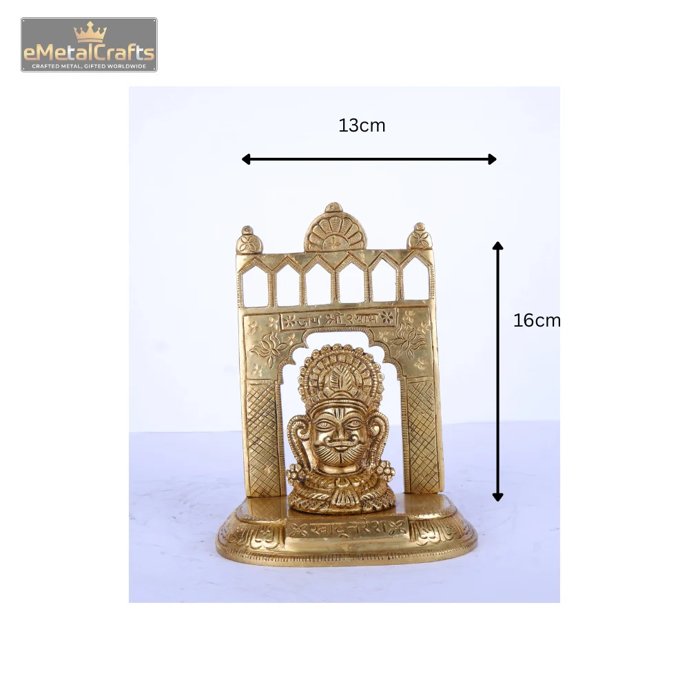 This intricately crafted brass khatu shyam god idol features a deity seated within a grand, traditional archway. The deity has a prominent, expressive face and appears to be adorned with a high crown or distinctive headpiece, characteristic of certain protective deities. The archway itself is highly detailed with traditional patterns and motifs, creating a regal frame for the central figure. Resting on a sturdy, ornate base, this piece embodies divine protection and spiritual energy, making it a powerful and visually striking addition to any sacred space or a cherished collection.