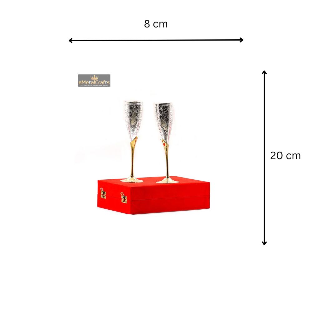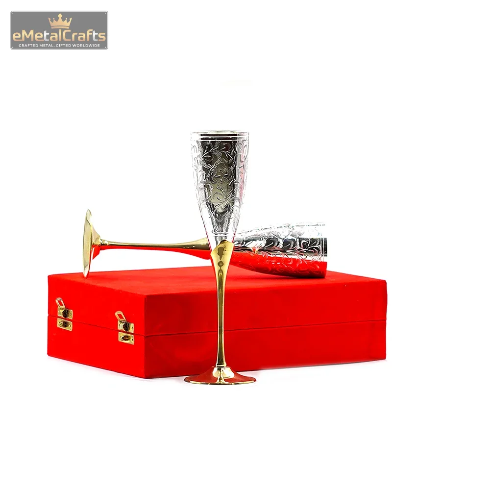 A sophisticated choice for commemorating special milestones, this stunning set includes two individually crafted 2 wine brass glasses presented in a vibrant red velvet-lined keepsake box. The design showcases a striking contrast: the tall, sculpted stems are finished in a brilliant polished brass, while the wide goblets feature an elegant silver-toned exterior adorned with intricate, hand-etched patterning. This two-tone metallic glassware is ideal for festive toasts, anniversaries, or as an impressive, ready-to-gift item.
