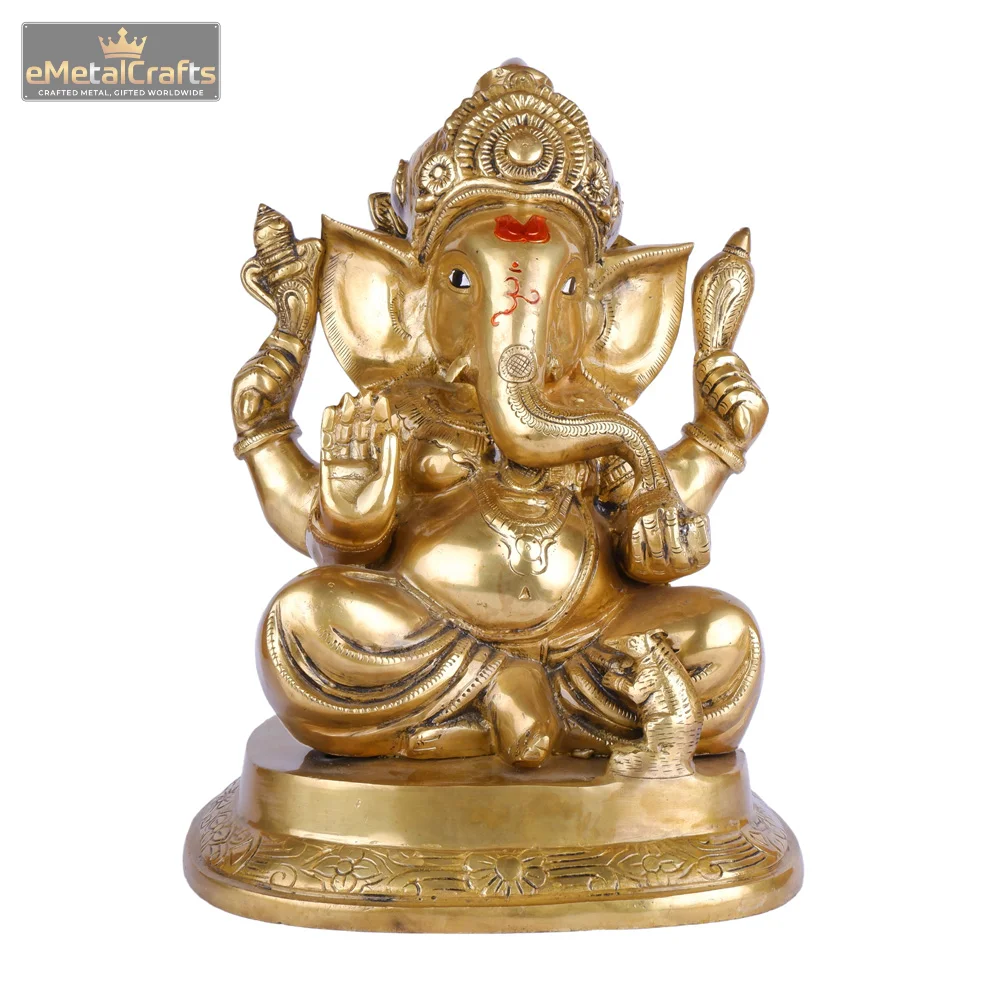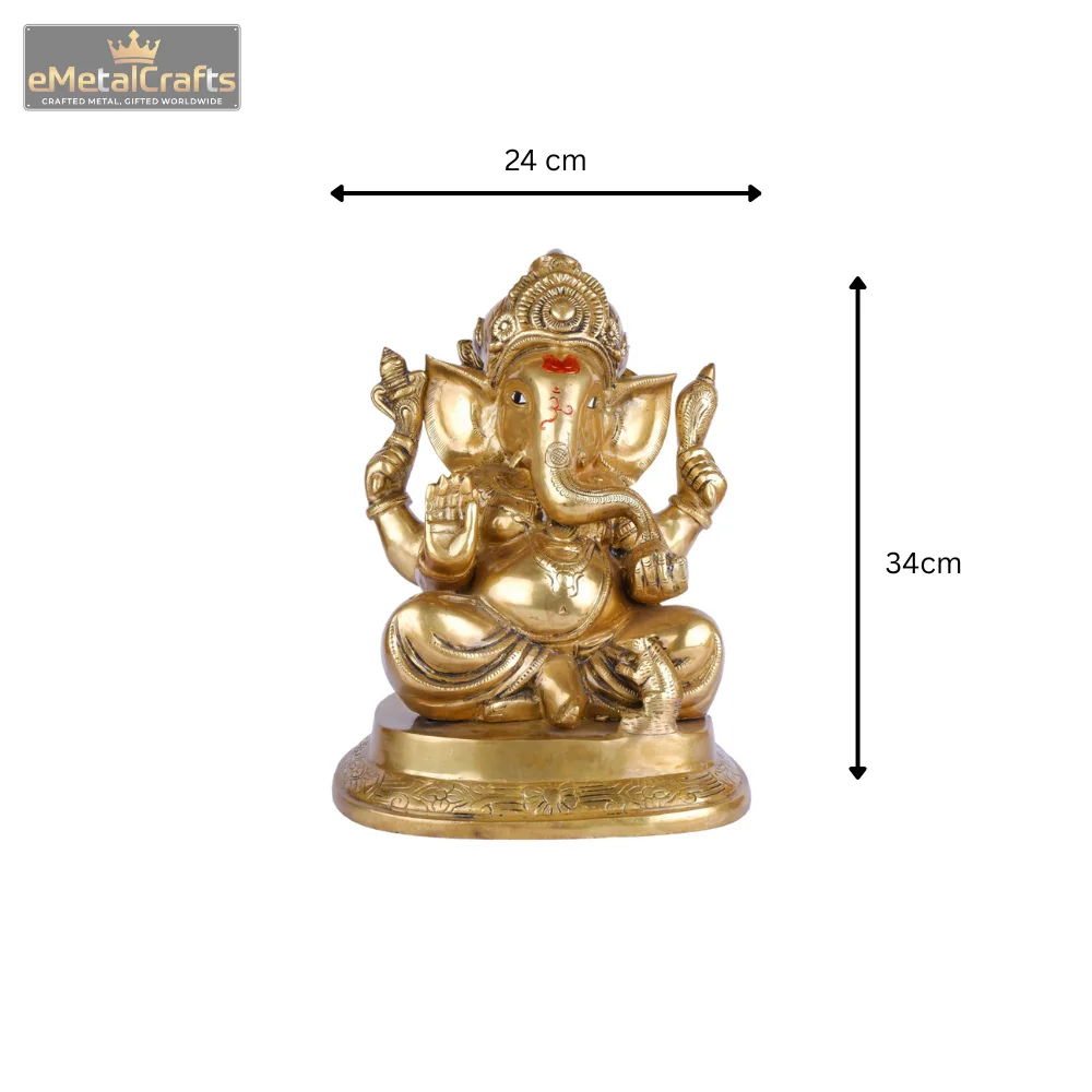 Commanding presence and intricate detail define this magnificent brass Golden Ganesha idol. Depicted in a traditional seated posture, this substantial piece showcases Ganesha with a regal crown and a prominent red tilak on his forehead, symbolizing wisdom and auspiciousness. His four arms are poised with symbolic attributes, while his endearing elephant head conveys benevolence. The idol rests securely on a sturdy, round pedestal adorned with intricate patterns, providing a solid foundation. Its golden finish highlights every finely sculpted detail, making this idol a profound symbol of prosperity and a truly impressive spiritual addition to any home, temple, or office.