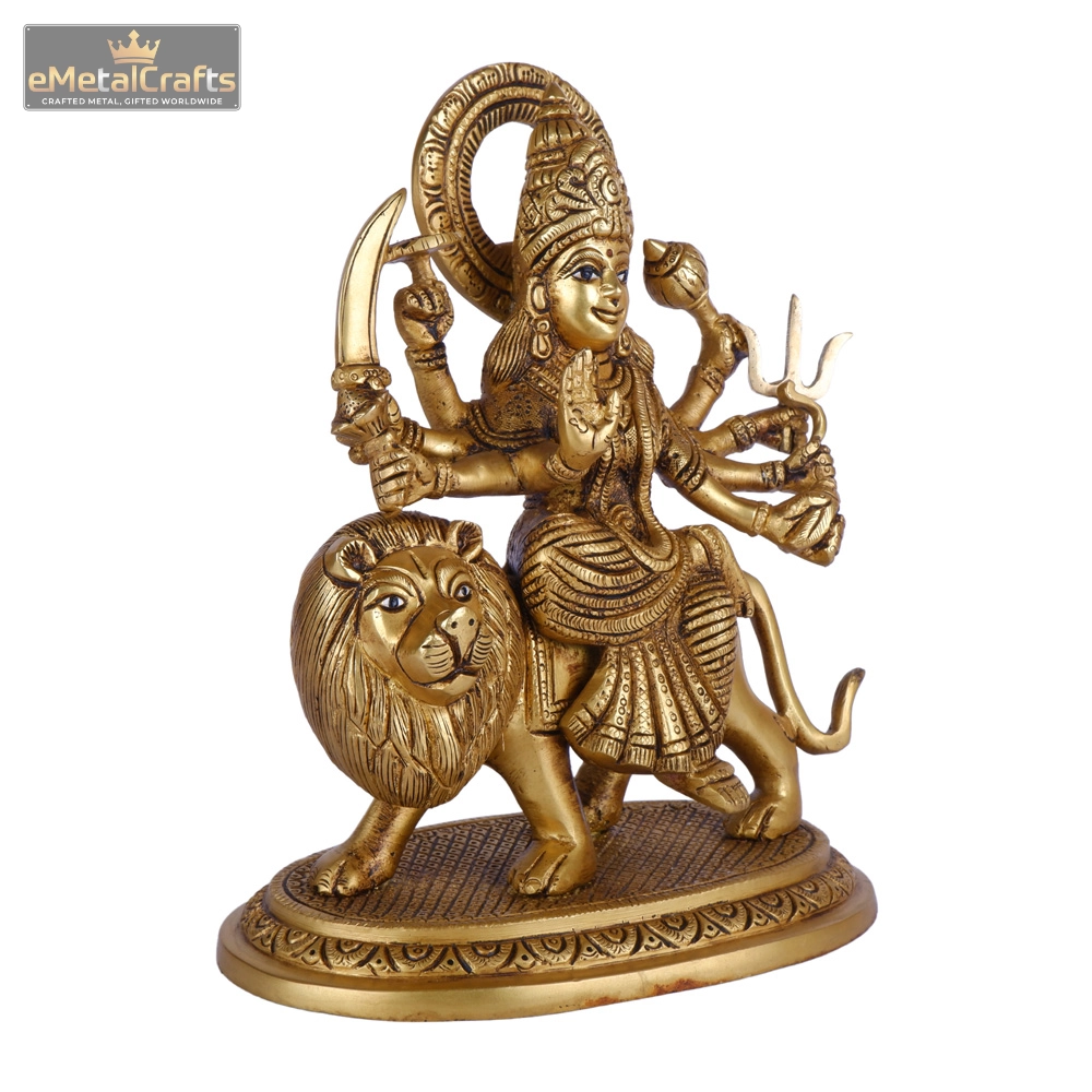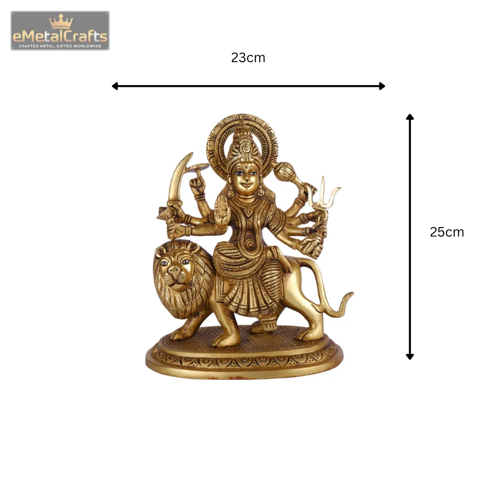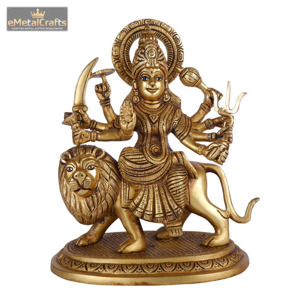 This exquisite statue depicts Goddess Pure Brass Durga Maa Devi Idol, revered as Sherawali Mata, triumphantly riding her lion mount. Crafted from premium quality brass, the deity is adorned with traditional ornaments and holds various weapons in her multiple arms, symbolizing her divine power and protection. The intricately detailed lion, her vahana (vehicle), is depicted in a powerful stance, signifying strength and courage. The entire sculpture rests on a decorative base, adding to its majestic presence. With its rich golden finish, this statue embodies spiritual grace and artistic mastery, making it an ideal addition to your prayer room, altar, or as a magnificent decorative piece for your home. It serves as a powerful symbol of divine strength, victory over evil, and spiritual well-being. This finely detailed piece also makes a profound and meaningful gift for devotees and collectors alike.