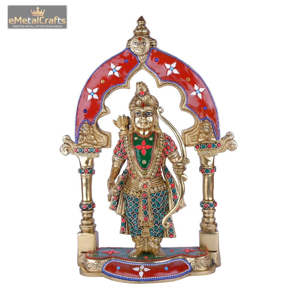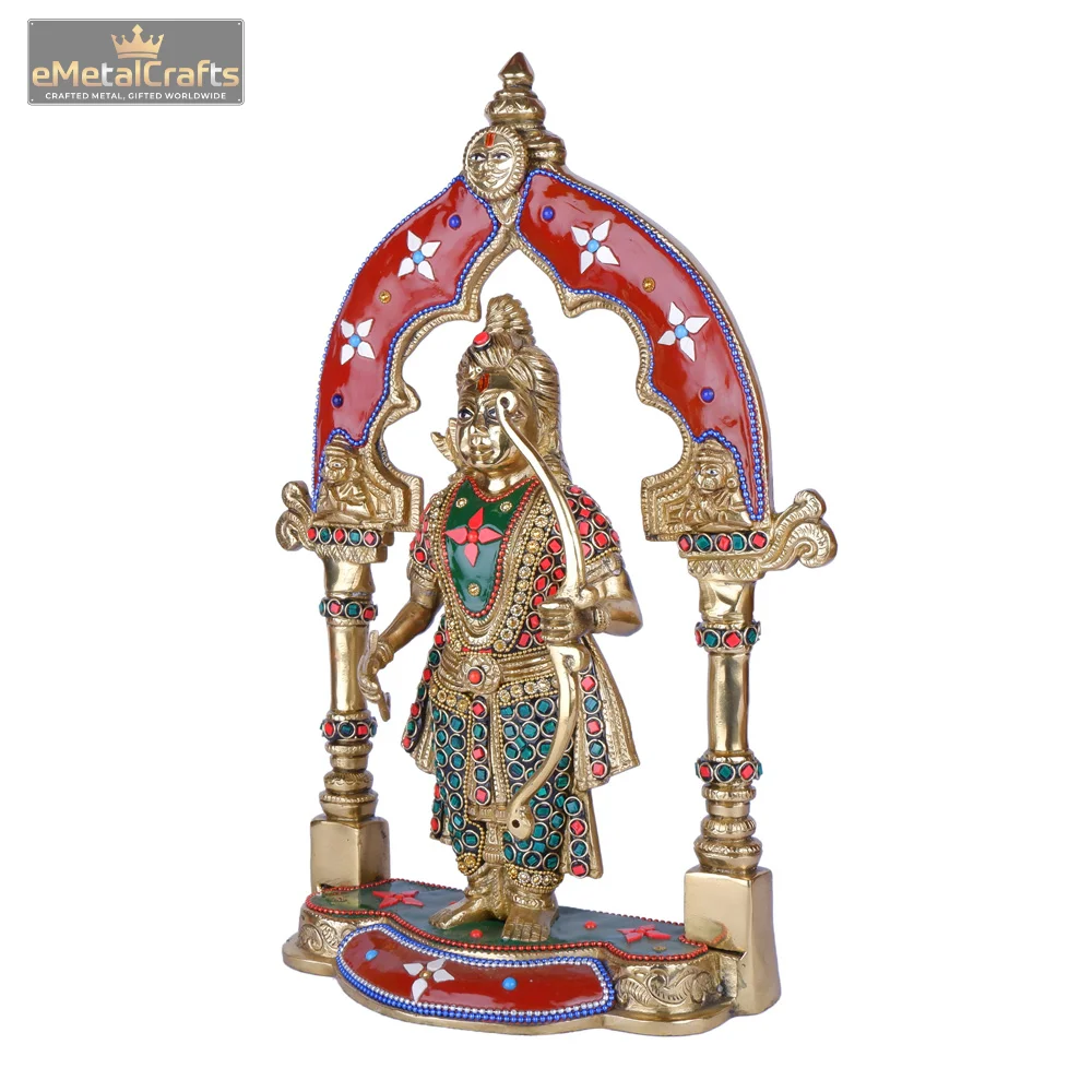 A beautiful brass idol of Lord Rama Brass Statue, adorned with enamel and stone detailing, depicting him with bow and arrow under an ornate arch, radiating divine protection and righteousness.